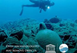 At the stern of Etnea lies another wreck, a cargo ship from ancient times, dated to 1st century. Remains are revealing two types of pottery that contained the precious trade goods the ship was carrying. Numerous fragments of amphorae – used to transport the wine – are scattered around.